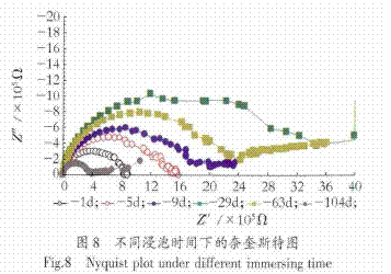 圖8為m(環氧乳液)∶m(固化劑)=4.5∶1時,不同浸泡時間下的奈奎斯特圖。