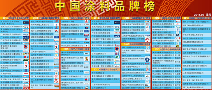 2014年 8月27日,“2013中國涂料品牌榜頒獎(jiǎng)典禮”在沈陽隆重舉行。中國涂料工業(yè)協(xié)會(huì)、中國房地產(chǎn)研究會(huì)、中華環(huán)保聯(lián)合會(huì)、中國涂料產(chǎn)業(yè)技術(shù)創(chuàng)新戰(zhàn)略聯(lián)盟等多家行業(yè)協(xié)會(huì)的領(lǐng)導(dǎo)出席了頒獎(jiǎng)典禮并擔(dān)任頒獎(jiǎng)嘉賓。出席本次頒獎(jiǎng)典禮的還有來自全國的涂料生產(chǎn)企業(yè)、涂料用原材料及顏填料生產(chǎn)企業(yè)和涂料裝備生產(chǎn)企業(yè)的300多名代表。