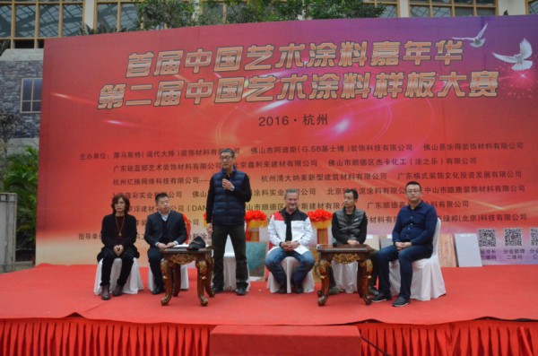 隨著中國(guó)涂料工業(yè)協(xié)會(huì)副秘書長(zhǎng)劉杰、中國(guó)涂料工業(yè)協(xié)會(huì)藝術(shù)涂料涂裝分會(huì)理事長(zhǎng)陶文生、秘書長(zhǎng)梁海生、杭州裝飾裝修商會(huì)涂料委會(huì)長(zhǎng)樓紅龍手中的紅綢飄然落下,標(biāo)志著首屆中國(guó)藝術(shù)涂料嘉年華暨第二屆中國(guó)藝術(shù)涂料樣板大賽于2016年12月17日在杭州拉開帷幕。浙江省涂料工業(yè)協(xié)會(huì)秘書長(zhǎng)馬新華、廣東省涂料行業(yè)協(xié)會(huì)秘書長(zhǎng)呂水列應(yīng)邀出席了活動(dòng)啟動(dòng)儀式。來(lái)自藝術(shù)涂料企業(yè)代表、涂裝工程師、下游經(jīng)銷商、代理商等共計(jì)將近1 300人參加了此次活動(dòng)。